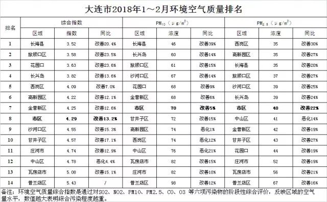 前两个月大连54个好天5个污染天今年 1-2 月,我市市区空气质量优 20 天,良 34 天,污染日 5 天,达标天数比例为 91.5%,同比上升 15.2 个百分点,优良天数增加 9 天,按综合指数排名全省第一。