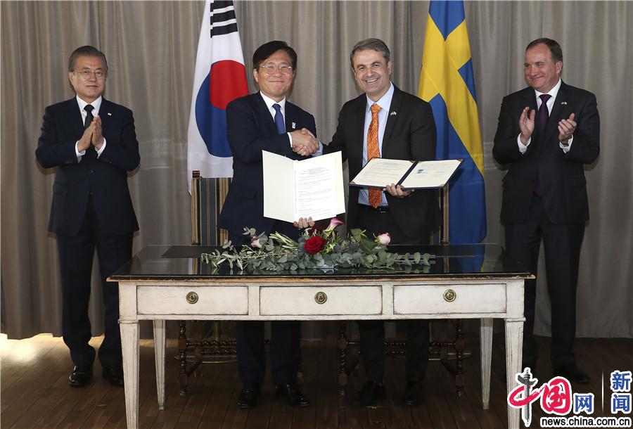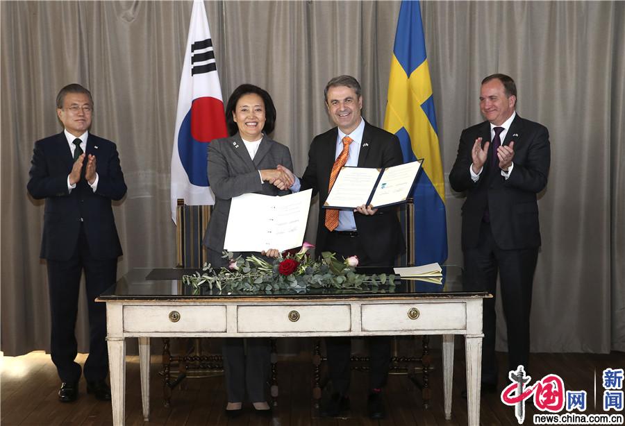 韩国贸易、工业和能源部长Sung Yun-mo和瑞典商业、工业和创新部长Ibrahim Baylan在两国元首斯德哥尔摩郊外花园酒店会晤后签署协议。(图片来源:东方IC)