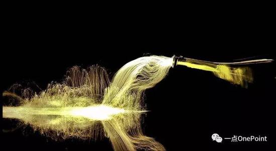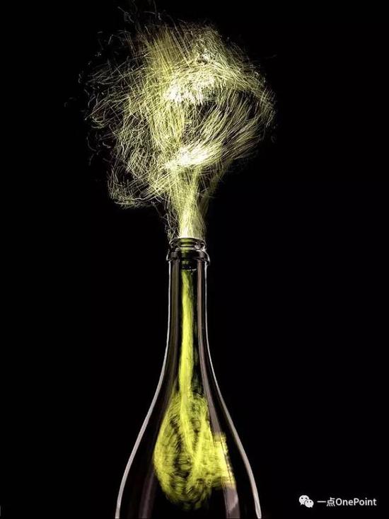 而同一瓶香槟,你也可以让它打翻在地,让光线从瓶子里流淌出来: