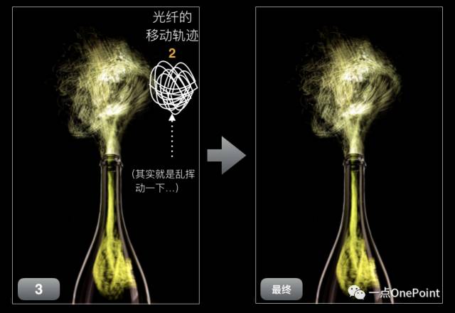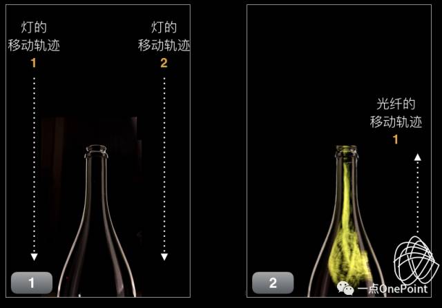 在上面这张图中,香槟酒瓶轮廓的绘制我想你已经能明白了,是通过灯在画面左右两边的移动来实现的,那么酒瓶中的黄色灯光和喷薄而出的香槟是怎么得到的呢?