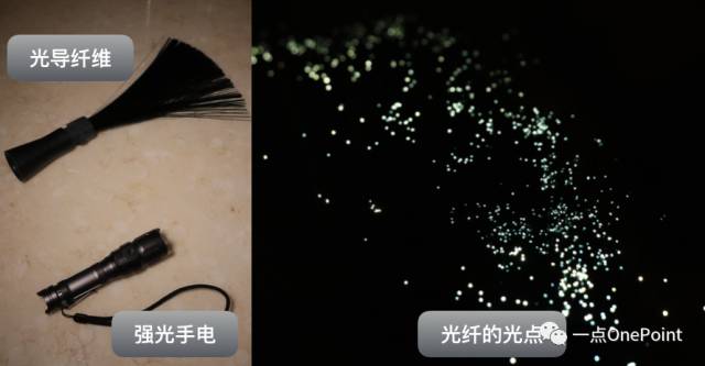 这是一种淘宝上能买到的光绘工具,通过一个强光手电照射光纤的一端,另一端就会形成上图右侧那样的一个个小光点。这样就能绘制更为细小的线条了。