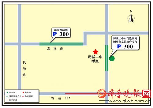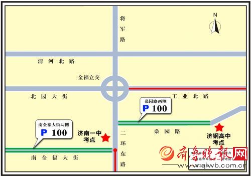 历下区:山师附中周边,由北向南单向通行,必要时将临时封闭山师北街,考生可在山师大北门或和平路山师北街路口下车后步行进入,考生家长的车辆可临时停放在历山剧院停车场、历山东路停车场、山师大院内;第七中学周边:解放路山大路口赛博数码广场地下、华强地下停车场、东郊饭店院内;