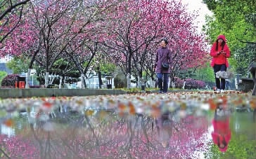 3月18日,市民行走在开满鲜花的长沙市开福区湘江风光带。初春三月,春雨微寒,长沙城区已是桃红柳绿,随处可见红色、粉红色的“彩带”,呈现出一片春意盎然的景象。