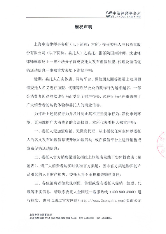 上海申浩律师事务所(以下简称:本所)接受委托人三只松鼠股份有限公司(以下简称:委托人)之委托,指派陶国南律师、沈建锋律师就市场上一些不法分子冒充委托人发布虚假加盟、代理及微信促销活动信息一事郑重发表如下维权声明: