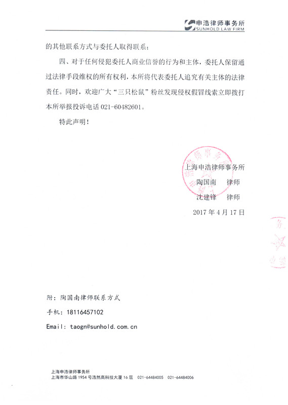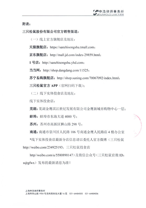 四、对于任何侵犯委托人商业信誉的行为和主体,委托人保留通过法律手段维权的所有权利,本所将代表委托人追究有关主体的法律责任。同时,欢迎广大“三只松鼠”粉丝发现侵权假冒线索立即拨打本所举报投诉电话021-60482601。